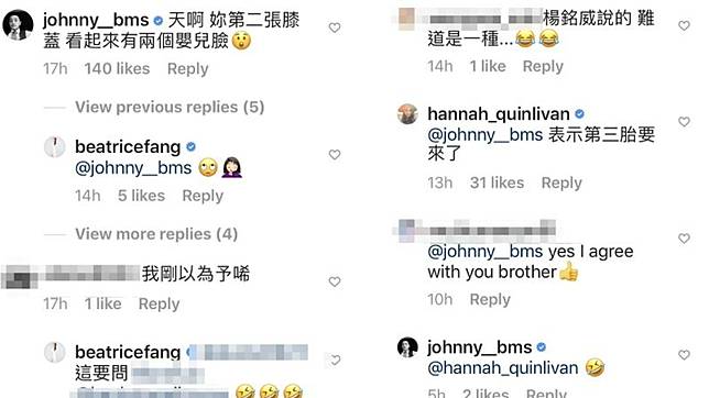 老公楊銘威也相當關注太太的社群動態,更眼尖發現對方的膝蓋出現兩個神似嬰兒臉的形狀,其他網友們看完也跟著笑虧「是雙胞胎呢!」、「可能又有好消息了,期待」,就連昆凌也忍不住留言「表示第三胎要來了!」或許害怕網友們信以為真,方志友隨後趕緊出面回應「別開玩笑了」,才化解這場鬧劇。