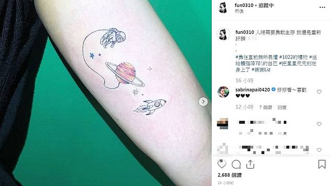 照片中,梁敏婷在手臂上刺上太空人、星星及火箭的圖案,另外還有一組英文字,她在貼文中表示把雙胞胎兒子星星、元元刻在身上了,藝人白家綺還留言表示「好好看~喜歡」。