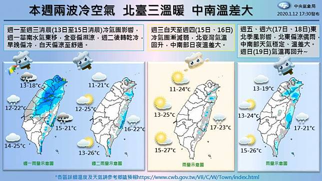 氣象局指出,從周三白天起至周四,冷氣團減弱,各地感猶如春暖花開,但受到輻射冷卻影響,中部以北低溫還是可能來到12至13度。接下來周五又會有一波東北季風報到,強度直逼冷氣團,所幸水氣不多,北台灣一整天還是偏涼偶有雨,預計要到下周日東北季風減弱,各地才會又回到好天氣。