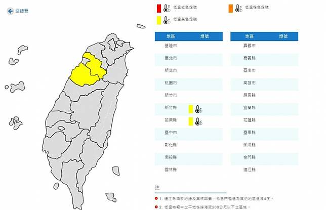 受到大陸冷氣團影響,根據氣象局指出,周一和二清晨最冷,中部以北低溫只有11至13度,新竹和苗栗山區更下探10度左右,氣象局已對此發布低溫黃燈特報。另外,北台灣這禮拜一下冷、一下熱,宛如洗三溫暖;中南部則是日夜溫差大,外出注意衣物增減。