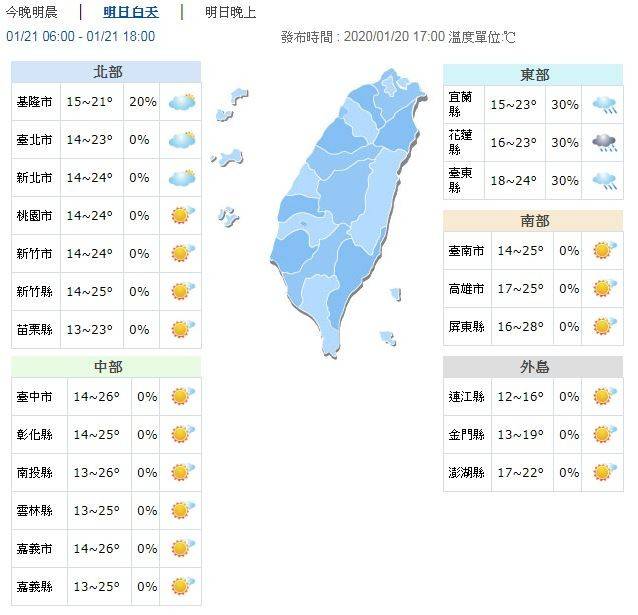 〔即時新聞/綜合報導〕中央氣象局預報,明(20)日白天因冷氣團減弱,環境轉為偏東風,僅東半部地區偶爾多雲、有局部短暫雨,其他地區皆為多雲到晴;春節期間從除夕午後開始整體天氣將轉為溼冷,中南部也有機率下雨。