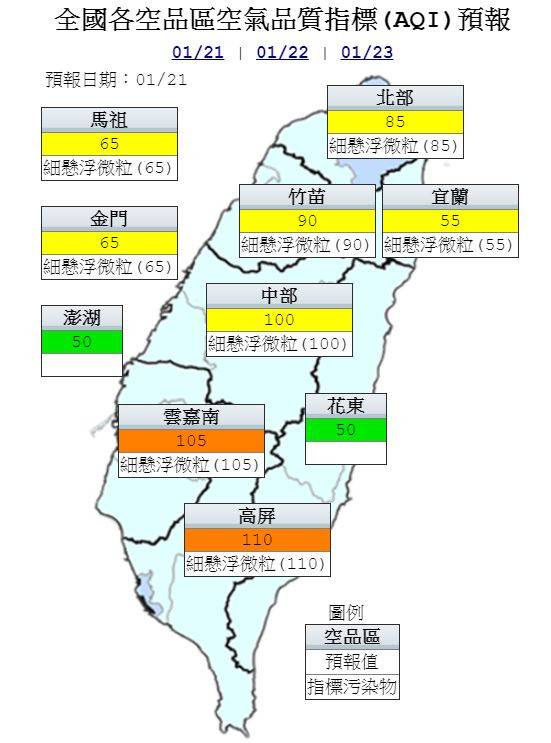 空品方面,花東空品區及澎湖為「良好」等級;北部、竹苗、中部、宜蘭空品區、馬祖及金門為「普通」等級,中部空品區近山區短時間為「橘色提醒」等級;雲嘉南及高屏空品區為「橘色提醒」等級。