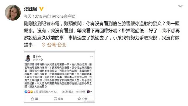 張鈺凰事後也在微博上回應,對於這麼久以前的事不想多說,事情過去就過去了,她強調「小孩我有努力爭取探視,我沒有做錯事!」