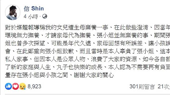 對於女兒身世引發風波,今天信親上火線澄清,他在臉書上發文強調張小姐絕無棄養,稱「因當年的環境無力撫養,才請家母代為撫養,期間張小姐也曾多次探望,可能是年代久遠,家母回想有所誤差,讓小孩誤會。」