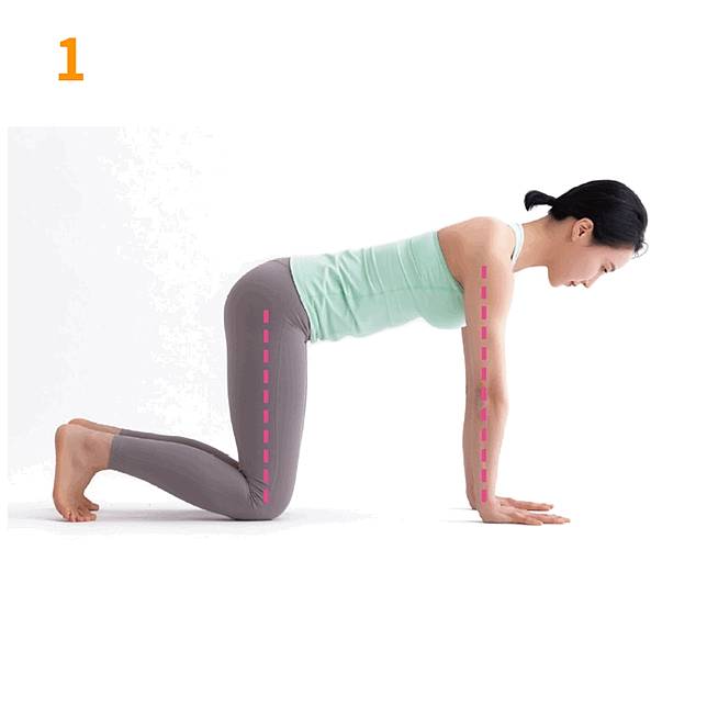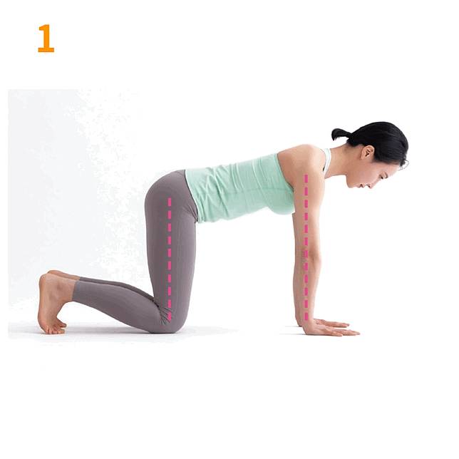 雙手和膝蓋緊貼地面,呈四足跪姿。手臂和大腿與地面呈垂直狀態,腳尖立起。