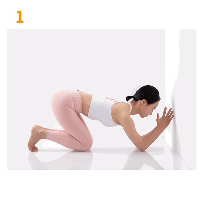 俯身屈膝,雙臂手肘彎曲並觸地。(Tip:兩側手肘與肩同寬。)