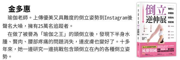 * 內容摘自《強核心.修體態.除贅肉.解痠痛,倒立逆伸展》,作者為金多惠,采實文化出版。