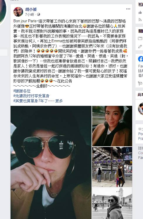 綜藝天王胡瓜的女兒、藝人小禎今(23日)證實結束12年婚姻,同時爆出和身價破億的「壁紙小開」丁春霆疑似交往中。小禎在晚間於臉書發文公告她與李進良糾葛12年的婚姻「全劇終」,並tag一句「許永元從今以後靠你養我跟Emma了」,引發臉友一陣肉搜「許永元」,不過,數小時後小禎在法國以直播影片公開了「誰是許永元」。