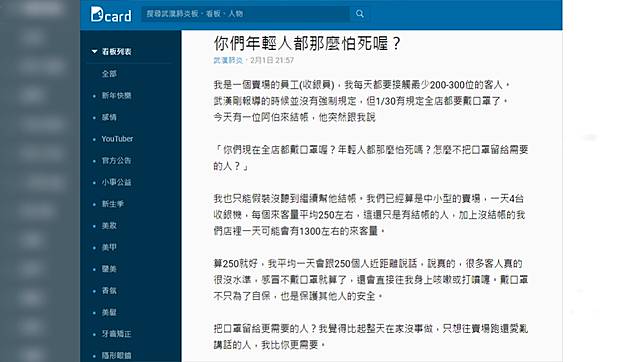 這名賣場女員工在「Dcard」發文表示,自己在賣場內負責收銀,每天都要接觸200-300位客人,先前武漢肺炎疫情爆發的時候還沒有強制規定,不過從1月30後規定全店員工都要戴口罩了。怎料,最近結帳的時候遇到一位阿伯冷嘲熱諷,「你們現在全店都戴口罩喔?年輕人都那麼怕死嗎?怎麼不把口罩留給需要的人?」原PO只能假裝沒聽到,繼續幫對方結帳。