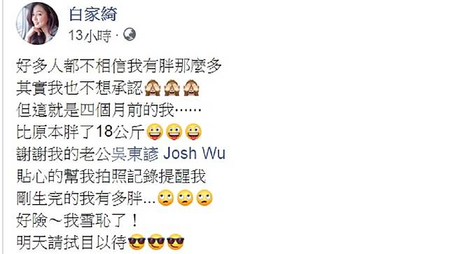 還有一張坐下來的照片更驚人,白家綺肚子大到宛如懷孕一樣,大腿更是黏在一起。白家綺特地感謝老公吳東諺貼心幫她拍照留下紀錄,提醒她剛生完到底有多胖,不過最後她也留下伏筆稱「好險~我雪恥了!明天請拭目以待。」據悉,她今(16日)將和老公一起出席代言活動。