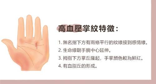 掌紋透露著人體的健康狀態,很多疾病在尚未出現明顯症狀之前,已經先於掌紋中顯示出來。如果可以在症狀出現前就找出問題並且及時調養,那麼許多慢性病及重症都可以成功預防。高血壓就是屬於能夠預知並預防的疾病之一。現在就攤開你的掌紋看看,有沒有出現下這些掌紋特徵吧。