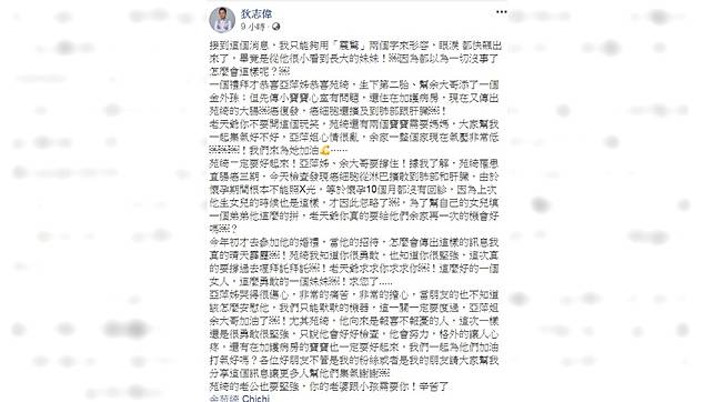 狄志偉透露,余苑綺罹患直腸癌3期,因為懷孕期間根本不能照X光,等於懷孕10個月都沒有回診,「上次他(她)生女兒的時候也是這樣,才因此忽略了,為了幫自己的女兒填(添)一個弟弟他(她)這麼的拼,老天爺你真的要給他們余家再一次的機會好嗎?」