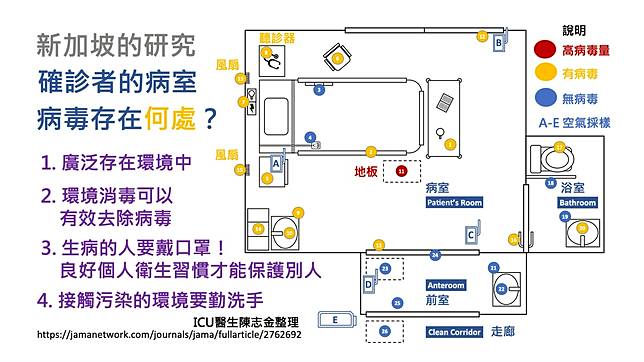 而新加坡的團隊則在3月4日發布了一篇研究,針對了確診患者的「隔離病房」進行病毒採檢,結果發現,隔離病房中確實充滿了病毒,包括桌子、椅子、馬桶、洗手台等地方都有病毒驗出;但在清潔過後,病毒量卻會大幅減少,而這個發現也登在全世界的權威期刊上《美國醫學會雜誌》(JAMA)。