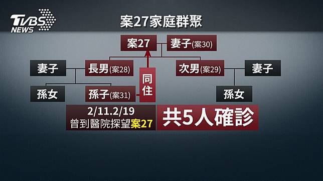 台灣確診再添一例,同樣也是案27的家人,包含先前確認的,案27以及妻子,還有兩位兒子,最新確診的大兒子的孩子,不僅和祖父同住,也曾兩度到醫院探望祖父,一家九口共五人確診,案31更是全台年紀最小的個案。