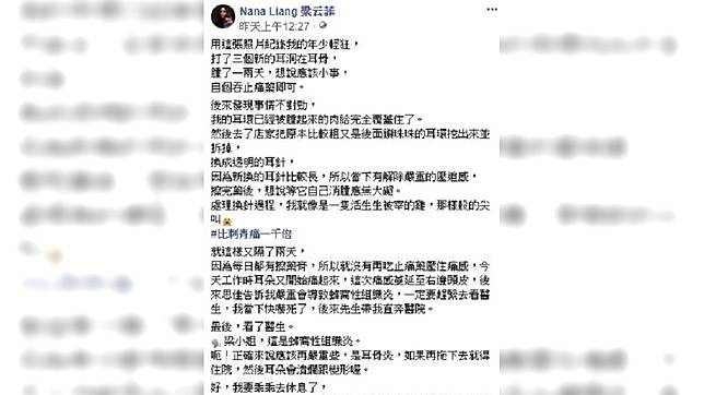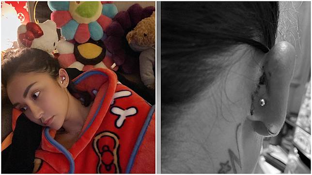 梁云菲在臉書透露,日前打完3個新耳洞後,耳骨部位腫了一兩天,認為只是小事,吃止痛藥即可,後來她察覺不對勁,「我的耳環已經被腫起來的肉給完全覆蓋住了」,趕緊去店家將原先的耳環拆掉、擦藥並換針。