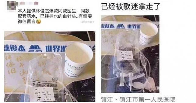 一名網友在微博PO出,「本人提供林俊傑爆款同款醫生,同款配套藥水,已經掛水的血針頭,有需要的請留言。」可以發現點滴外包裝寫著「林」,病房號碼也都清楚註明。經其他網友查出,該名網友竟然疑似適醫護人員;大家紛紛痛批,沒有職業操守。