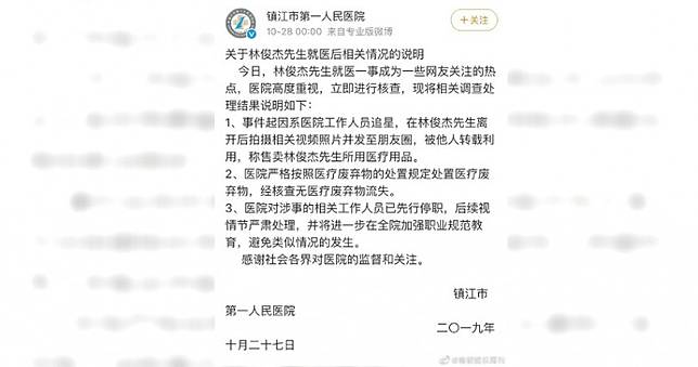 林俊傑26日在大陸鎮江開唱,演唱會結束後身體不適到當地鎮江市第一人民醫院吊點滴,不料之後竟有人將他使用過的醫療器材PO網轉賣。對此院方回應,經查無醫療廢棄物流失,會對相關人員進行懲處,後續將進一步加強教育訓練。