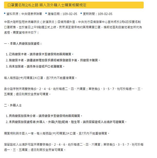 此外,也針對外籍人士購買補充相關規定,外籍人士具有健保加保身分者,請持健保卡至健保特約藥局購買;未具健保加保資格者:外國人、外籍(大陸)配偶、陸生等,請持居留證或入出境許可證購買,購買規則與本國人一樣,每人每張證(卡)可購買2片口罩,且7天內不能重複購買,官方也提供英文的說明版本,並在新聞稿中有較詳細說明。
