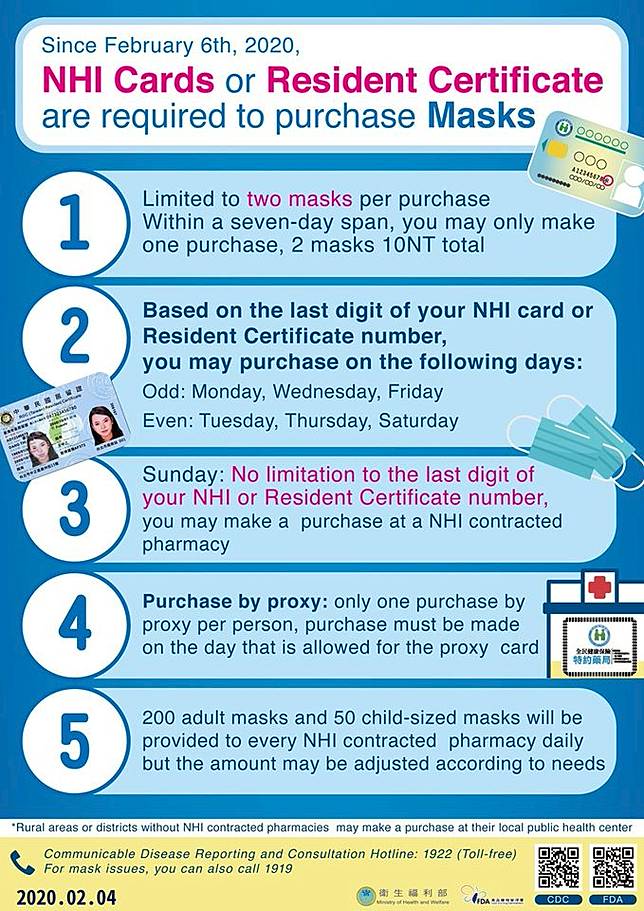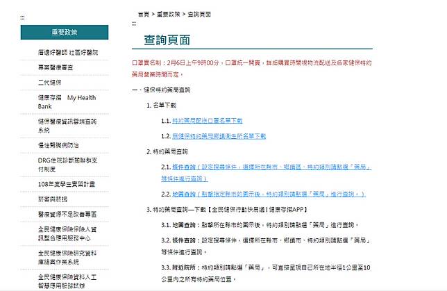 2月6日起有關武漢肺炎的最新政策,就是「口罩實名制」,衛生福利部也正式公開預計2月6日上午9點開放購買,同日預計開放查詢口罩庫存。一般民眾可至健保署全球資訊網首頁「社區特約藥局專區」使用相關查詢功能。
