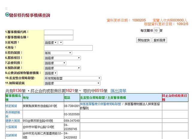 如果用特約藥局查詢的條件查詢,便會連到健保署的「健保特約醫事機構查詢」頁面,可透過條件如地區、藥局篩選出最近的購買點,並匯出清單: