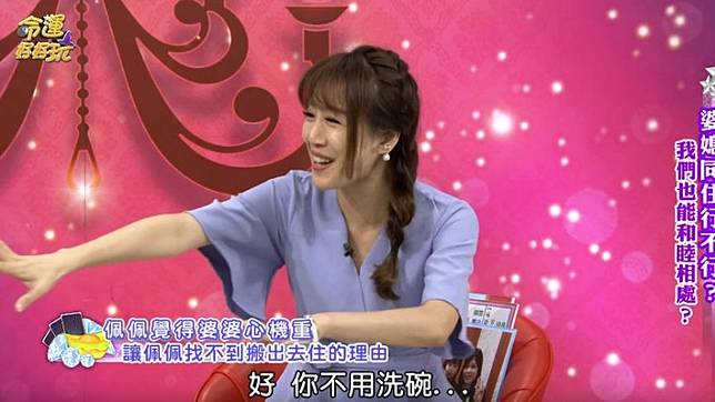 佩佩透露在桃園住透天厝,但沒想到是整個大家族都在同一間大房子中,光吃個飯就要15個碗,她透露婆婆把房子隔一半但一樓相通,她仍然有自己私密空間,但也驚覺找不到理由搬出去,「我第一天去洗碗,然後就腰直不起來了,因為婆婆個子不高流理台很低,我就彎著洗,傷到去針灸」,從此婆婆叫她不用洗,她才釋懷:「不用洗碗又不用做家事。」當場讓主持人何篤霖、廖家儀傻了,今佩佩表示婆婆真的很疼她,朋友都稱羨。