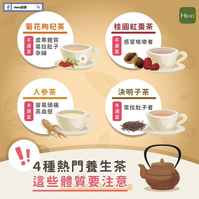 養生茶雖然可以生津解渴、保養身體,但你有想過你的體質適合嗎?如果沒有搞清楚自己的體質,就亂喝養生茶可是會弄巧成拙的喔!以下就來告訴你,4款熱門的養生茶哪些體質不太適合喝。