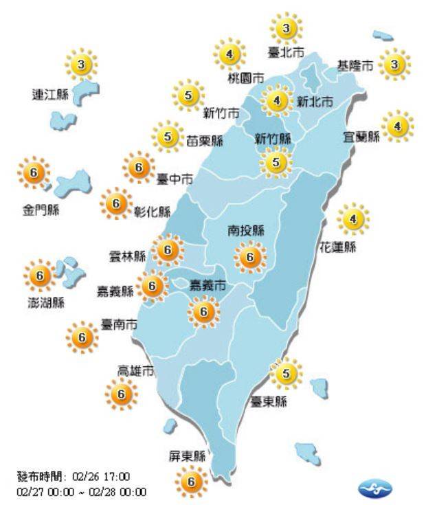 紫外線方面,明天台中市、彰化縣、雲林縣、嘉義市、嘉義縣、南投縣、台南市、高雄市、屏東縣、金門縣及澎湖縣為橘色「高量級」,其他地區則皆為黃色「中量級」。