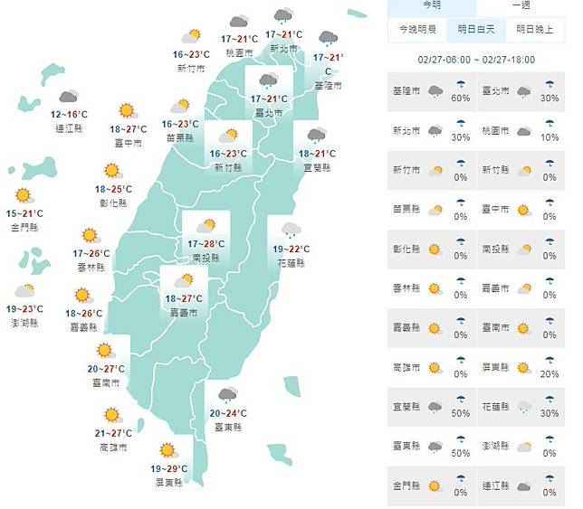 中央氣象局預報,今晚到明天東北季風增強影響,除了東北部明顯降溫外,桃園以北及東半部雲量偏多有局部短暫雨,西半部山區亦有零星降雨,其他地區仍為多雲到晴的天氣。