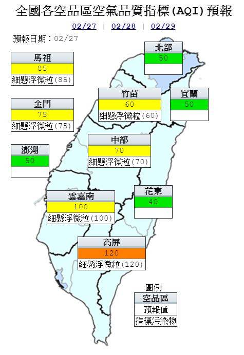 空品方面,明天受東北季風增強影響,雲嘉南以南空品區位於下風處,污染物易累積,北部、宜蘭、花東空品區及澎湖地區為「良好」等級;竹苗、中部、雲嘉南空品區及馬祖、金門地區為「普通」等級,雲嘉南局部地區短時間可能達「橘色提醒」等級;高屏空品區為「橘色提醒」等級。
