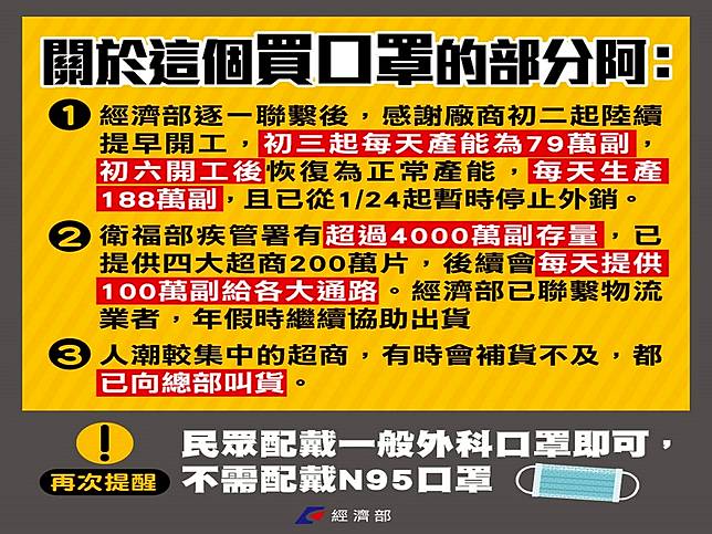 經濟部強調,從1/24起,國內產製的口罩已經暫時停止外銷,而衛福部疾管署有超過4000萬副存量,已提供四大超商200萬片,後續會每天提供100萬副給各大通路(包括藥妝店、電商及超商),經濟部已聯繫物流業者,年假時繼續協助出貨。至於車站、休息站等人潮較集中的超商,有時會補貨不及,但總部仍有庫存。