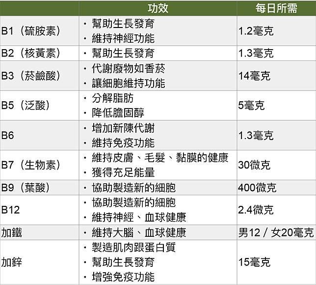 不過每一種維生素B還有各自的功能;像是B1可以幫助生長發育,對小孩子來說,可以幫助他們的身體成熟,而B5可以幫助分解脂肪,降低體內的膽固醇。
