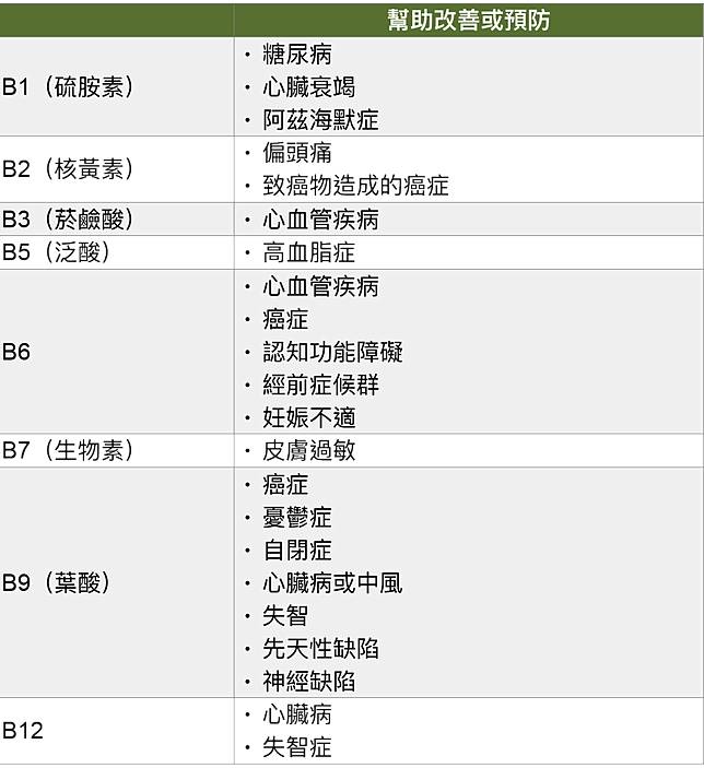 維生素B群目前共有8種,分別是B1、B2、B3、B5、B6、B7、B9、B12,每一種維生素B都可以幫助代謝,同時還可以幫助身體對抗「致癌物」帶來的危害,可以快速的把致癌物代謝掉;另外,也能維持神經的正常功能,所以能預防失智的發生。