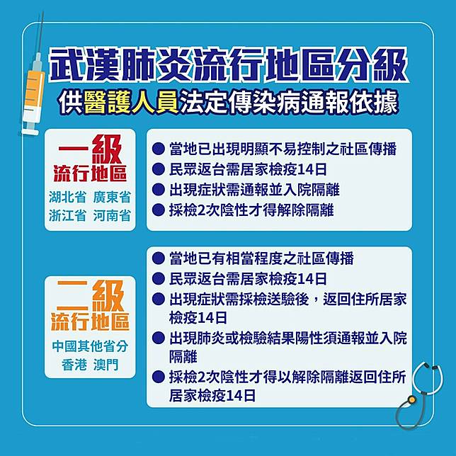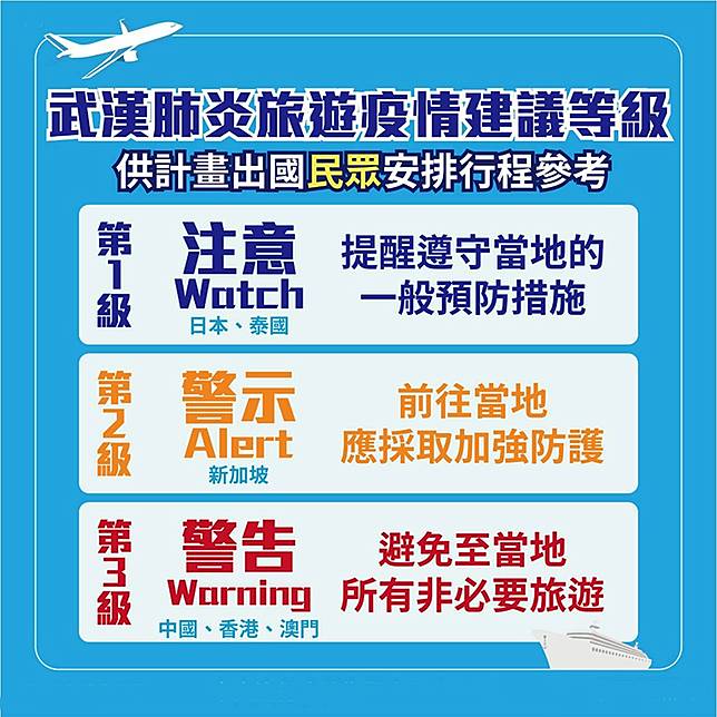 目前(2月17日18時)武漢肺炎1級流行區域,包含中國大陸湖北省、廣東省、浙江省、河南省。武漢肺炎2級流行區域,包含中國大陸其他省分、香港、澳門。武漢肺炎旅遊疫情建議等級,第1級注意包含日本與泰國,第2級警示有新加坡,第3級警告則是中國大陸、香港、澳門。
