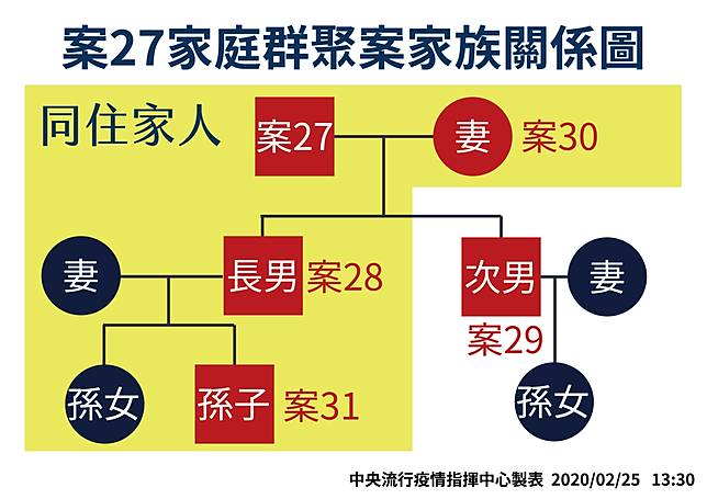 據指揮中心宣布,本次的家庭群聚中,爸爸(案27)本身是具高血壓、糖尿病等慢性病的洗腎病人,近期無出國史。他與妻子早上平時早上待在大兒子家,晚上住在小兒子家。他於2月6日出現咳嗽、流鼻水等症狀,9日因發燒、診斷為肺炎而收治單人病房治療,16日出現呼吸急促情形轉至加護病房,但是病情還算穩定。