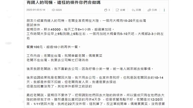 近日一名網友透露,先前在朋友的介紹下,當起有錢人家的司機,月薪4萬5,每天工作8小時,休假日大概10天左右,原本以為只是單純開車,偶爾買菜或打雜即可,怎料老闆竟想把他培訓成私人管家,暴增的工作量令他超崩潰。