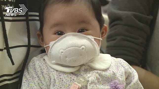 4個月大嬰兒戴著迷你號口罩,爸媽朋友特別在網路買到,讓嬰兒也罩得住。