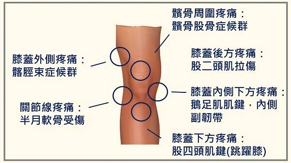 膝蓋痛的原因千奇百種,有時蹲下會痛,有時站著不痛也痛,有時還會發出「喀喀聲」,到底是怎麼回事呢?透過下圖讓我們更分辨膝痛的原因。