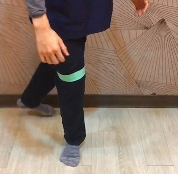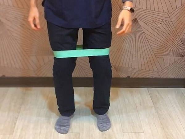 彈力帶繞過膝蓋外側,右腳在前,左腳在後,身體自然下蹲,一組做8下,每天做3組。