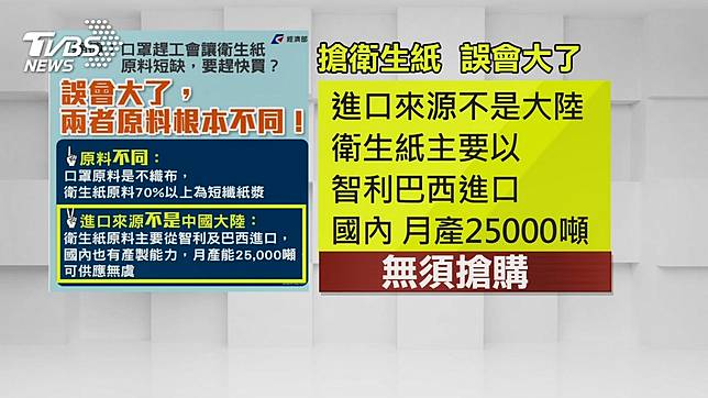 衛生紙真的不用搶,經濟部乾脆畫圖表跟大家說清楚,口罩的原料是不織布,衛生紙則是有百分之70是短纖紙漿,而且主要是從智利跟巴西進口而非大陸,加上台灣每月可以生產25000噸,供貨充足,民眾根本不需要盲目搶購。