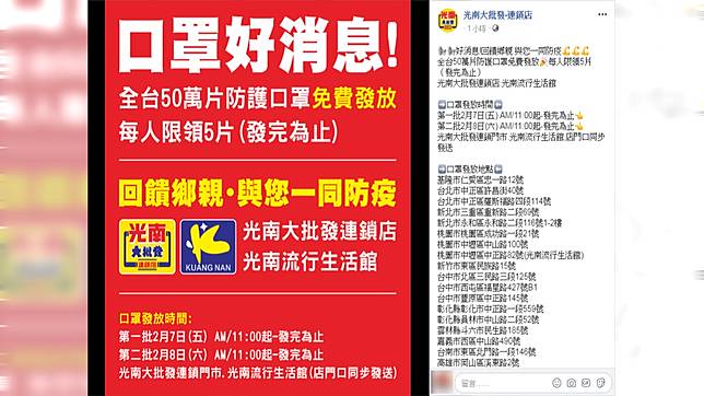 武漢肺炎疫情持續延燒,人人搶口罩防疫。光南大批發連鎖店昨(4日)宣布將於全台25家門市發送50萬片免費口罩,讓許多人大讚佛心。不過也有人質疑,口罩嚴重缺貨,50萬片口罩從哪來?光南公司今(5日)給予回應。