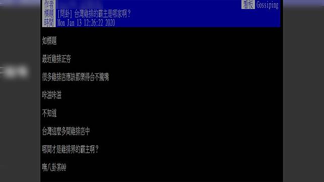 這名網友在「PTT」八卦板發文表示,最近雞排是最夯的話題,很多雞排店都樂得合不攏嘴,不過原PO很好奇,「台灣這麼多間雞排店中,哪間才是雞排界的霸主啊?」原PO認為,論口感是派克雞排,「外送都還能脆脆的」,但要是論口味則是澎湖三哥酒釀雞排,「而且要本店」。