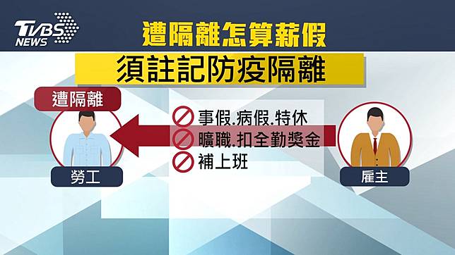 針對被隔離勞工的薪資,衛福部將召集相關部會討論修法,給予補償,勞動部也說,勞雇雙方可以自己協商薪資,至於請假的部份,從武漢回台的勞工都會收到居家隔離通知書,因為配合防疫,雇主不能要求勞工請事假、病假或特休,也不能用曠職、扣全勤獎金或補上班來處份,只要在假別註記防疫隔離就好。