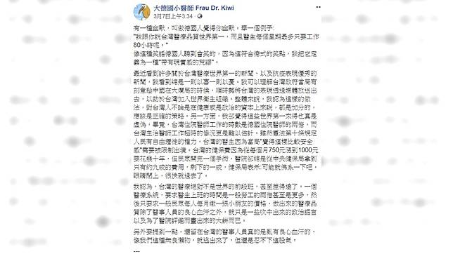 一名在德國醫院工作的台灣醫師,7日在臉書粉專「大德國小醫師 Frau Dr. Kiwi」中發文表示,「有一種幽默,叫做德國人覺得你幽默。舉一個例子:『我跟你說台灣醫療品質世界第一,而且醫生每個星期最多只要工作80小時呢。』」