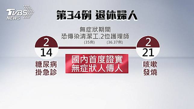 不過專家擔心,第34例退休婦人,從2月14日掛急診,直到21號才出現咳嗽發燒,代表無症狀的一個禮拜,恐怕傳染給清潔工跟3位護理師,有醫師認為,這是國內首度證實,沒有症狀也會人傳人的案例,只是目前這5位,狀況最危險的,是第34例的退休婦人,目前使用呼吸器,有嚴重的肺炎,後續確診的1位清潔工,以及3位護理師,都沒有肺炎,只有輕微的呼吸道症狀。