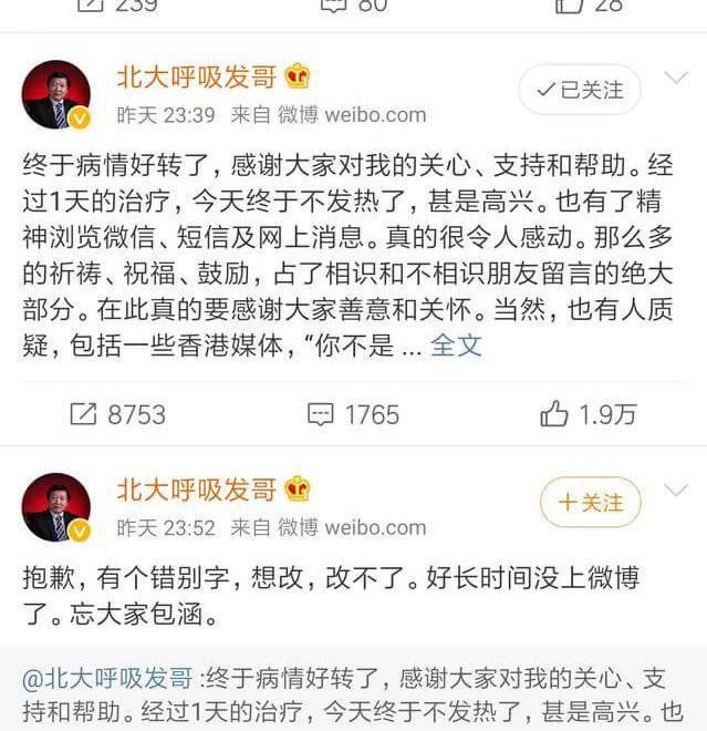 因為醫治武漢肺炎病患而自己也被感染的北京大學第一醫院呼吸和危重症醫學科主任王廣發,經過一天的治療後已經不再發熱。他在微博中表示,此前感染新型冠狀病毒所致的肺炎,病毒可能是從「結膜」傳染。