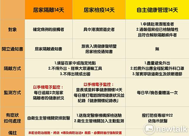 根據中央流行疫情指揮中心資料,若與確診個案有一定程度接觸,就屬於居家隔離的對象;若具有中國大陸、香港及澳門地區旅遊史,或從特定流行地區入境民眾,則屬於居家檢疫對象;兩者同樣都不可外出、不可搭乘大眾交通工具;監測方式則略微不同,居家隔離者由衛生機關監測,居家檢疫者則由里長執行。此外,根據《傳染病防治法》規定,違反居家檢疫者可處1-15萬元罰鍰;違反居家隔離者則可處6-30萬元罰鍰。