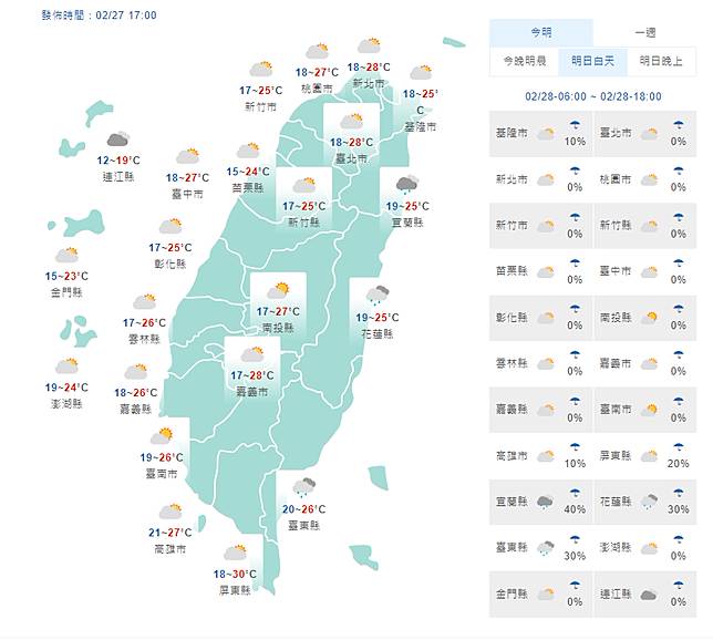 根據中央氣象局預測,28日起東北季風減弱,28日至3月1日上午各地大致多雲到晴,僅東半部地區及北部山區有局部短暫雨;28日清晨東北部地區仍有局部較大雨勢發生的機率。