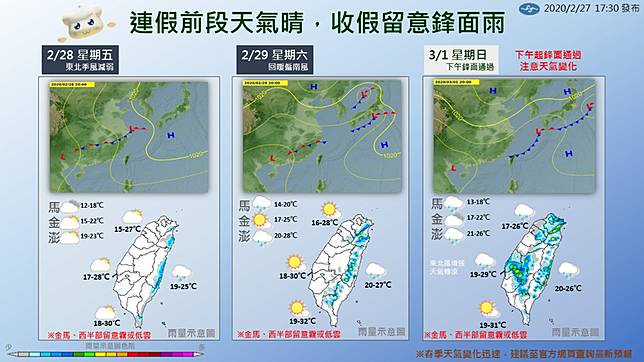 228連假來臨,因東北季風減弱,台灣各地及澎湖、金門、馬祖大致多雲到晴,僅東半部地區及北部山區有局部短暫雨,中南部、大台北地區高溫上看28至30度,但連假過後卻有2波冷空氣接連襲來,強度不排除達冷氣團等級。