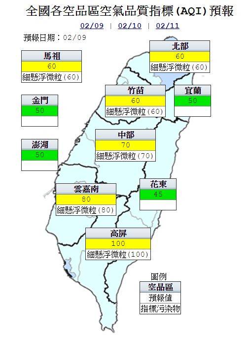 空氣品質方面,明宜蘭、花東空品區,及澎湖、金門為「良好」等級;北部、竹苗、中部、雲嘉南、高屏空品區,及馬祖為「普通」等級。