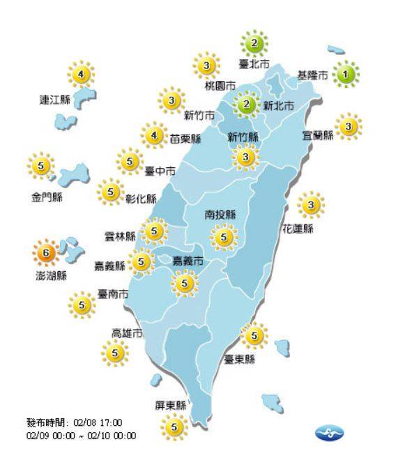 紫外線方面,除了澎湖縣為「高量級」,台北市、新北市,及基隆市為「低量級」,其餘地區皆為「中量級」。
